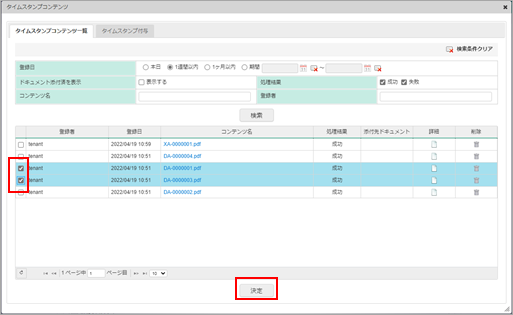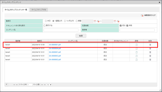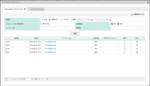 失敗:タイムスタンプ付与失敗したコンテンツを検索します。コンテンツ名 入力内容に部分一致するコンテンツを検索します。 登録者 入力内容に部分一致するコンテンツを検索します。 「検索」ボタン 条件に合致するコンテンツを検索結果欄に表示します。 <検索結果欄>
