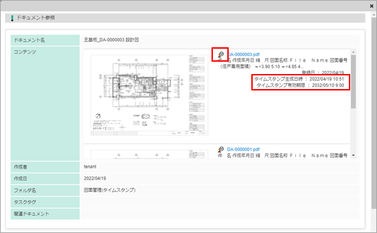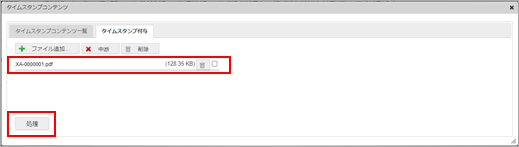 失敗:タイムスタンプ付与に失敗添付先ドキュメント コンテンツを含むドキュメントを表示します。 詳細 タイムスタンプ情報を表示します。 削除 タイムスタンプコンテンツを削除します。 コラム