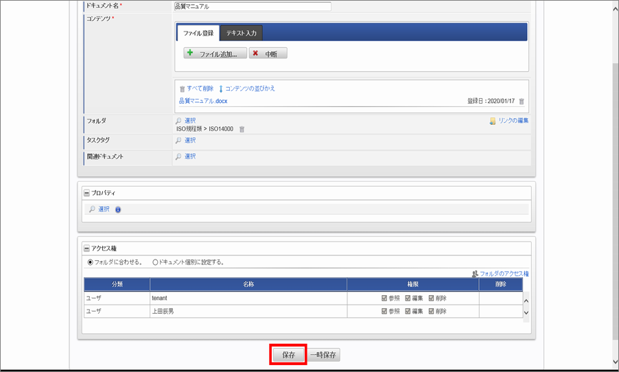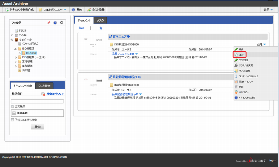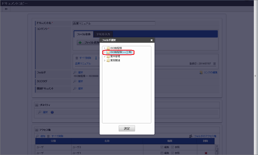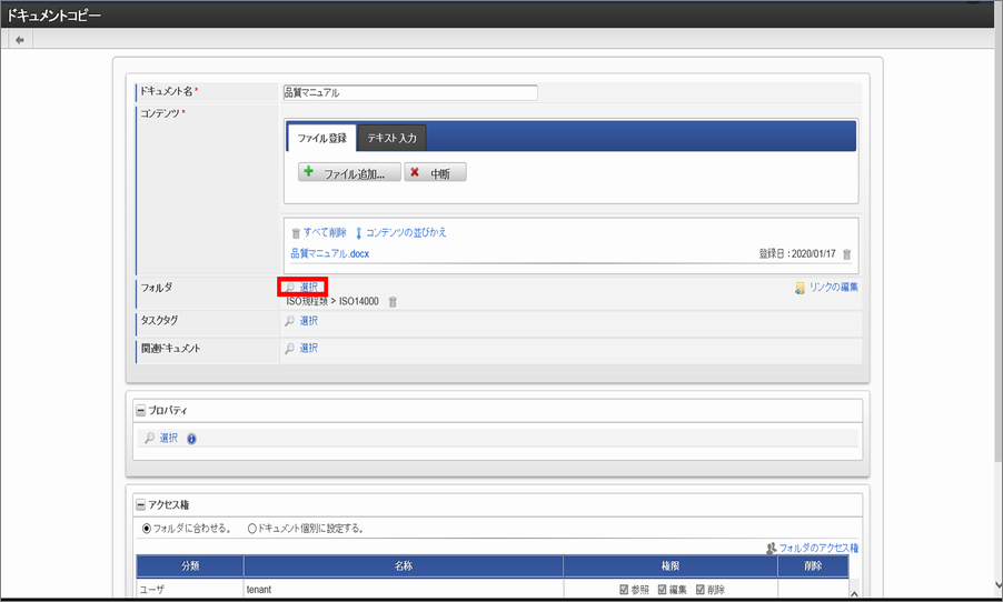 ドキュメントをコピーするには、以下の権限が必要です。・コピー元ドキュメントに対する「ドキュメント編集」権限・コピー先フォルダに対する「ドキュメント編集」権限