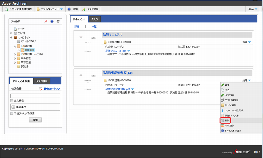 削除するドキュメントの「処理」をクリックし「削除」を選択します。
