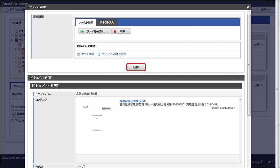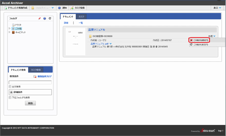 ドキュメントを削除するには、「ドキュメント削除」権限が必要です。