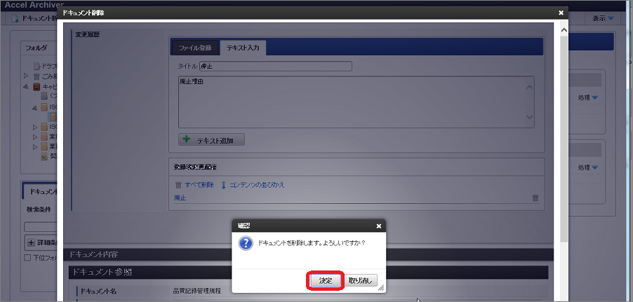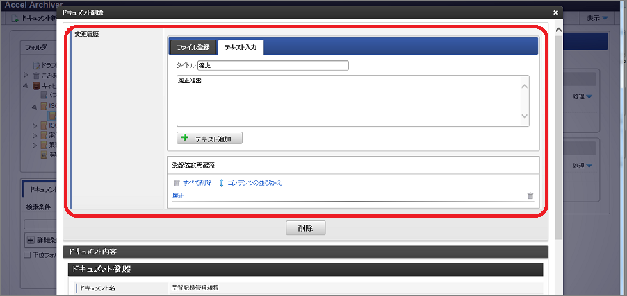 ドキュメントを削除した際、結果は設定されているプロパティやドキュメントの状態により異なります。・「レビジョン」関連のプロパティが設定されているドキュメント旧レビジョンのドキュメントとして扱われます。・「ワークフロー連携」プロパティが設定されているドキュメント削除申請が承認されるとごみ箱に移動します。・「レビジョン」関連+「ワークフロー連携」プロパティが同時に設定されているドキュメント削除申請が承認されると旧レビジョンのドキュメントとして扱われます。・一時保存中のドキュメント完全削除されます。(ごみ箱には移動しません)・上記に該当しないドキュメントごみ箱へ移動します。