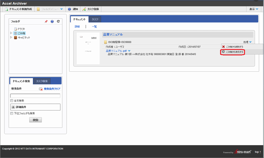 ごみ箱へ移動されたドキュメントを完全に削除したい場合は、「処理」をクリックし「ごみ箱から削除する」を選択してください。