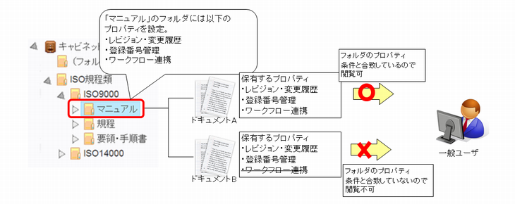 下図ドキュメントBのようにフォルダのプロパティ条件を満たさないドキュメントは、管理レベルを満たさないドキュメントとして、一般ユーザへは閲覧を不可能な状態とします。