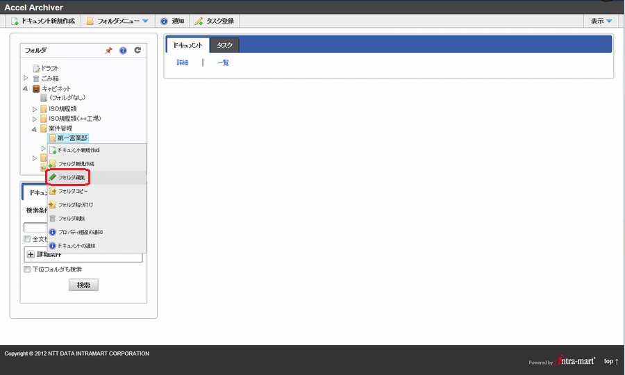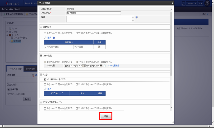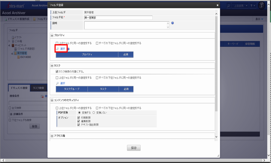 フォルダごとにプロパティを定義することで、配下に作成するドキュメントに対し管理レベルを設定できます。