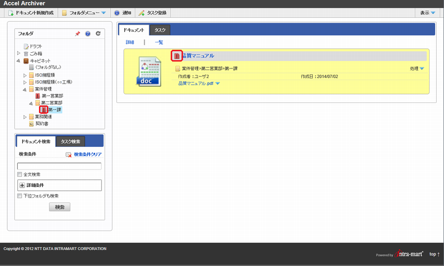 管理レベルに不一致なドキュメント、およびそのドキュメントが所属しているフォルダが注意アイコンで表示されます。