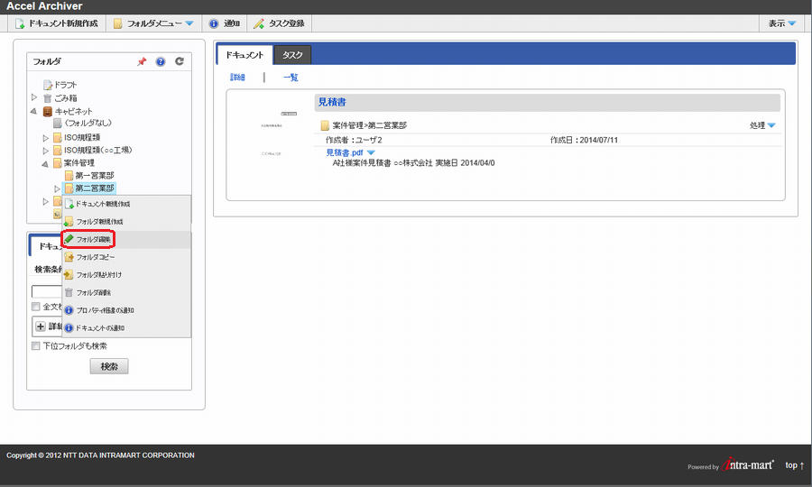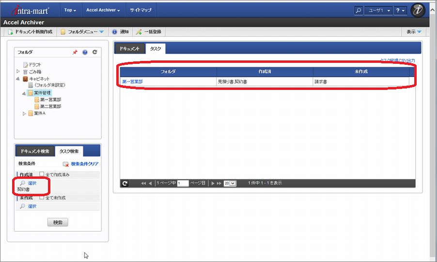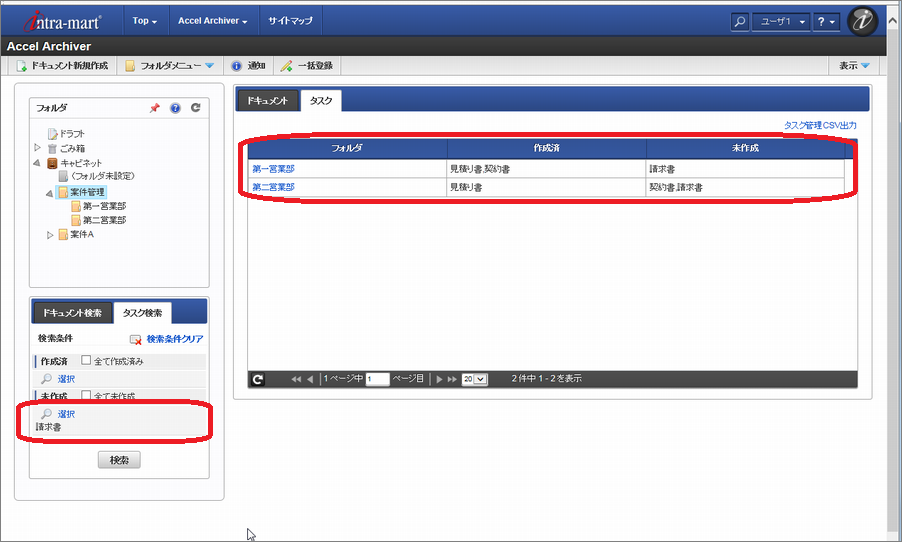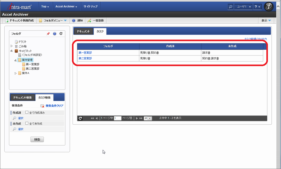 項目 説明 検索条件クリア 検索条件をクリアします。 作成済 フォルダタスクで指定されたタスクの内、選択したタスクが設定されたドキュメントが保存されているフォルダを検索します。 未作成 フォルダタスクで指定されたタスクの内、選択したタスクが設定されたドキュメントが保存されていないフォルダを検索します。 「検索」ボタン 条件に合致するフォルダタスクとドキュメントを検索結果欄に表示します。