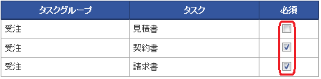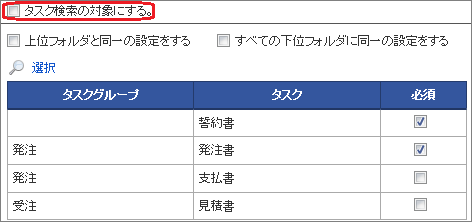 ・タスクを上位フォルダと同一の設定とする場合、「上位フォルダと同一の設定をする」を有効にしてください。・設定したタスクを下位フォルダに反映する場合、「すべての下位フォルダに同一の設定をする」を有効にしてください。反映する対象はフォルダのみであり、ドキュメントには影響しません。・タスクの作成を必須としたい場合は「必須」にチェックを入れてください。