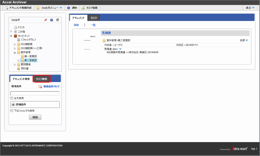 - タスク検索により、ドキュメントの作成状況を確認できます。タスク検索では、フォルダタスクとフォルダ配下のドキュメントのタスクとの整合性を検出することで必要なドキュメントが作成されていることまたは、必要なドキュメントが作成されていないことを判定します。タスク検索の概要については、 本ドキュメントのタスク検索とは を参照してください。「タスク検索」タブをクリックします。