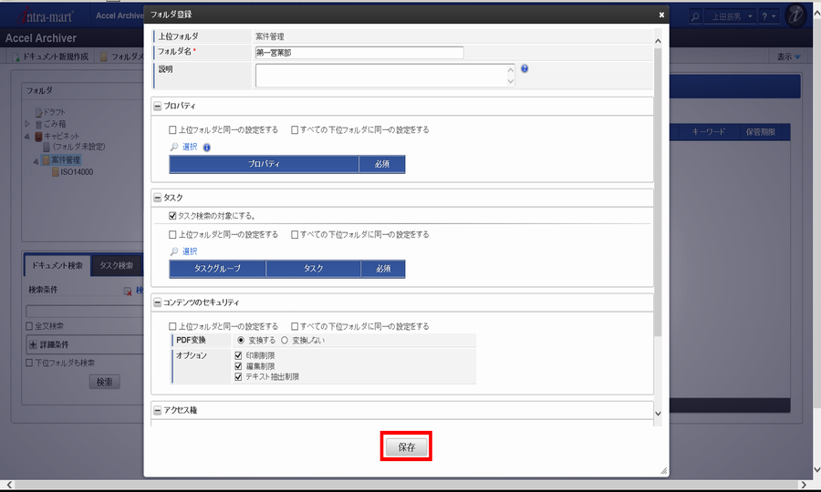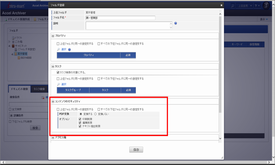 フォルダごとにPDF変換設定をすることで、配下に作成するドキュメント内のコンテンツに対し、セキュリティを付与できます。