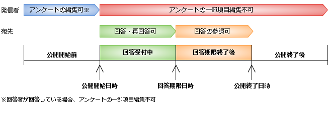 ステータス 説明 編集中 アンケートが一時保存されている状態です。「アンケート回答一覧」画面では、アンケートが表示されません。 公開開始前 アンケートが公開期間前の状態です。「アンケート回答一覧」画面では、アンケートが表示されません。 回答受付中 アンケートが回答期間内の状態です。「アンケート回答一覧」画面では、アンケートが表示され、宛先は回答、再回答、および、回答が参照できます。 回答期限終了後 アンケートが回答期限終了後の状態です。「アンケート回答一覧」画面では、アンケートが表示され、宛先は回答が参照できます。 公開終了後 アンケートが公開期間後の状態です。「アンケート回答一覧」画面では、アンケートが表示されません。コラム