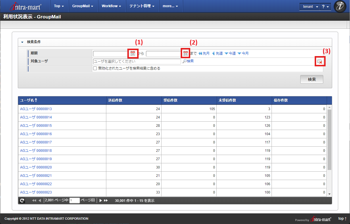 ■ 利用状況一覧の検索条件について利用状況一覧の検索を行う際、デフォルトでは必須入力項目はありませんが、必須にする項目を intra-mart Accel GroupMail 設定ファイル(conf/iag-system-config.xml) で変更できます。■ 利用状況一覧の表示について利用状況一覧の表示件数は、intra-mart Accel GroupMail 設定ファイル(conf/iag-system-config.xml) の設定に従います。ページャ部の表示件数切り替え用セレクトボックスの表示はありません。送信件数、受信件数、未受信件数、保存件数の書式は”#,##0”となります。操作項目