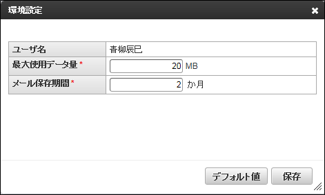最大使用データ量、メール保存期間でユーザシステム設定情報が存在しない場合のデフォルト設定値は、システム設定ファイルの設定に従います。システム設定ファイルについては「 設定ファイルリファレンス 」-「 システム設定ファイル 」を参照してください。操作項目