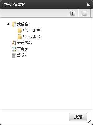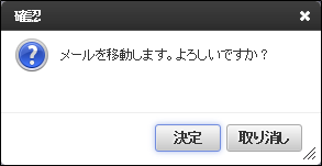 フォルダツリー「-」をクリックすると、フォルダツリーを全て折りたたみます。 決定 フォルダを選択し、「決定」をクリックすると、呼び出し元画面のフォルダ設定欄に選択したフォルダを設定します。呼び出し元がメール移動の場合は、表示されません。移動 フォルダを選択し、「移動」をクリックすると、呼び出し元画面で選択したメールを選択したフォルダに移動します。呼び出し元がメール移動以外の場合は、表示されません。処理実行前にメッセージダイアログを表示して、処理継続の確認を行います。(1)呼び出し元画面で選択したメールを、選択したフォルダに移動します。(2)フォルダ選択ダイアログを閉じます。(3)メイン画面のフォルダツリーとメール一覧を再表示します。(4)移動対象のメールをメイン画面のメールプレビューに表示していた場合はメールプレビューを空欄にします。全ての処理が完了すると、成功メッセージボックスを表示します。メッセージダイアログで「取り消し」を実行した場合は処理を中止します。注意