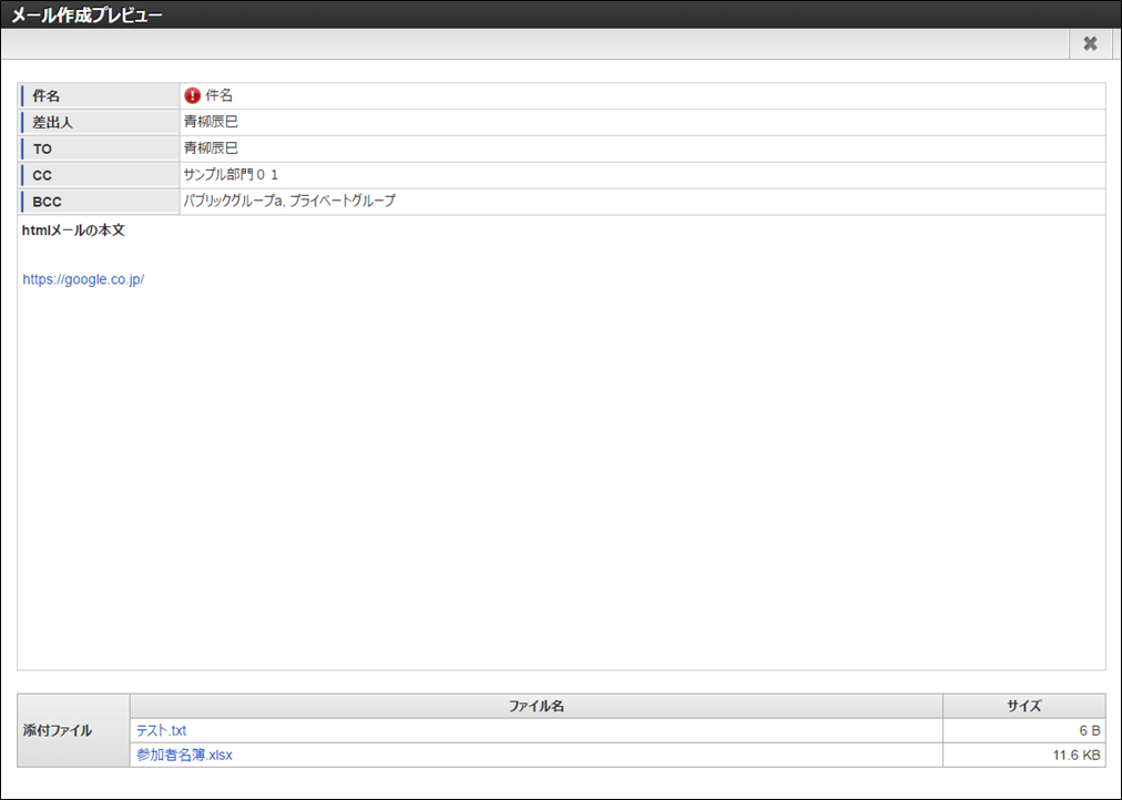 項目 説明 件名 メールの件名を表示します。件名が未設定の場合は”<件名なし>”を表示します。差出人 メールの差出人を表示します。 TO メールの宛先(TO)のユーザ名、会社・組織名、パブリックグループ名、プライベートグループ名を表示します。TOが未設定の場合は非表示となります。CC メールの宛先(CC)のユーザ名、会社・組織名、パブリックグループ名、プライベートグループ名を表示します。CCが未設定の場合は非表示となります。BCC メールの宛先(BCC)のユーザ名、会社・組織名、パブリックグループ名、プライベートグループ名を表示します。BCCが未設定の場合は非表示となります。メールの作成者が閲覧する場合、全ての宛先(BCC)を表示します。BCCの受信者が閲覧する場合、受信者の名前のみ表示します。本文 メールの本文を表示します。本文中のURLはリンクで表示されます。添付ファイル一覧 保存した添付ファイルが存在する場合、ファイル名の昇順に一覧表示します。添付ファイルを追加した場合、添付ファイルの一覧を追加順に表示します。1. ファイル名添付ファイルのファイル名をリンク表示します。ファイルのダウンロードが認可されていない場合は、リンク表示されません。添付ファイルの有効期限が切れている場合、リンク表示せず、取り消し線を表示します。2. サイズ添付ファイルのサイズを表示します。コラム
