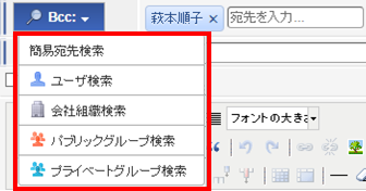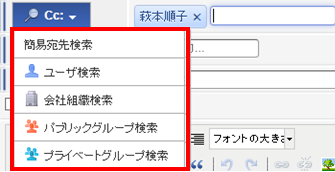 メール作成画面を閉じます。処理実行前にメッセージダイアログを表示して、処理継続の確認を行います。(1)メッセージダイアログで「決定」を実行します。(2)メール作成画面を閉じます。メッセージダイアログで「取り消し」を実行した場合は処理を中止します。CC、BCCを表示 メール作成画面「CC、BCCを表示」をクリックすると、CC、BCCの設定欄を表示します。CC、BCCが表示されている場合は非表示となり、「CC、BCCを非表示」を表示します。CC、BCCを非表示 メール作成画面「CC、BCCを非表示」をクリックすると、CC、BCCの設定欄を非表示にします。CC、BCCが表示されていない場合は非表示となり、「CC、BCCを表示」を表示します。宛先検索(TO) メール作成画面「宛先検索(TO)」をクリックすると、宛先(TO)の検索方法を選択するドロップダウンメニューを表示します。1. 簡易宛先検索(TO)2. ユーザ検索宛先(TO)を設定する IM-共通マスタ 検索画面を表示します。IM-共通マスタ 検索画面で決定したユーザは宛先(TO)の末尾に設定されます。表示する IM-共通マスタ 検索画面の設定は以下の通りになります。ユーザ選択 複数選択 基本情報 編集不可 検索画面タブ ユーザ(キーワード)会社組織(キーワード)会社組織(ツリー)パブリックグループ(キーワード)パブリックグループ(ツリー)プライベートグループ3. 会社・組織検索宛先(TO)を設定する IM-共通マスタ 検索画面を表示します。IM-共通マスタ 検索画面で決定した会社・組織は宛先(TO)の末尾に設定されます。表示する IM-共通マスタ 検索画面の設定は以下の通りになります。グループ選択 複数選択 基本情報 編集不可 検索画面タブ 会社組織(キーワード)会社組織(ツリー)4. パブリックグループ検索宛先(TO)を設定する IM-共通マスタ 検索画面を表示します。IM-共通マスタ 検索画面で決定したパブリックグループは宛先(TO)の末尾に設定されます。表示する IM-共通マスタ 検索画面の設定は以下の通りになります。グループ選択 複数選択 基本情報 編集不可 検索画面タブ パブリックグループ(キーワード)パブリックグループ(ツリー)5. プライベートグループ検索宛先(TO)を設定する IM-共通マスタ 検索画面を表示します。IM-共通マスタ 検索画面で決定したプライベートグループは宛先(TO)の末尾に設定されます。表示する IM-共通マスタ 検索画面の設定は以下の通りになります。グループ選択 複数選択 基本情報 編集不可 検索画面タブ プライベートグループ 宛先削除(TO) メール作成画面「宛先削除(TO)」をクリックすると、選択した宛先(TO)を削除します。宛先検索(CC) メール作成画面「宛先検索(CC)」をクリックすると、宛先(CC)の検索方法を選択するドロップダウンメニューを表示します。1. 簡易宛先検索(CC)2. ユーザ検索宛先(CC)を設定する IM-共通マスタ 検索画面を表示します。IM-共通マスタ 検索画面で決定したユーザは宛先(CC)の末尾に設定されます。表示する IM-共通マスタ 検索画面の設定は以下の通りになります。ユーザ選択 複数選択 基本情報 編集不可 検索画面タブ ユーザ(キーワード)会社組織(キーワード)会社組織(ツリー)パブリックグループ(キーワード)パブリックグループ(ツリー)プライベートグループ3. 会社・組織検索宛先(CC)を設定する IM-共通マスタ 検索画面を表示します。IM-共通マスタ 検索画面で決定した会社・組織は宛先(CC)の末尾に設定されます。表示する IM-共通マスタ 検索画面の設定は以下の通りになります。グループ選択 複数選択 基本情報 編集不可 検索画面タブ 会社組織(キーワード)会社組織(ツリー)4. パブリックグループ検索宛先(CC)を設定する IM-共通マスタ 検索画面を表示します。IM-共通マスタ 検索画面で決定したパブリックグループは宛先(CC)の末尾に設定されます。表示する IM-共通マスタ 検索画面の設定は以下の通りになります。グループ選択 複数選択 基本情報 編集不可 検索画面タブ パブリックグループ(キーワード)パブリックグループ(ツリー)5. プライベートグループ検索宛先(CC)を設定する IM-共通マスタ 検索画面を表示します。IM-共通マスタ 検索画面で決定したプライベートグループは宛先(CC)の末尾に設定されます。表示する IM-共通マスタ 検索画面の設定は以下の通りになります。グループ選択 複数選択 基本情報 編集不可 検索画面タブ プライベートグループ 宛先削除(CC) メール作成画面「宛先削除(CC)」をクリックすると、選択した宛先(CC)を削除します。宛先検索(BCC) メール作成画面「宛先検索(BCC)」をクリックすると、宛先(BCC)の検索方法を選択するドロップダウンメニューを表示します。1. 簡易宛先検索(BCC)2. ユーザ検索宛先(BCC)を設定する IM-共通マスタ 検索画面を表示します。IM-共通マスタ 検索画面で決定したユーザは宛先(BCC)の末尾に設定されます。表示する IM-共通マスタ 検索画面の設定は以下の通りになります。ユーザ選択 複数選択 基本情報 編集不可 検索画面タブ ユーザ(キーワード)会社組織(キーワード)会社組織(ツリー)パブリックグループ(キーワード