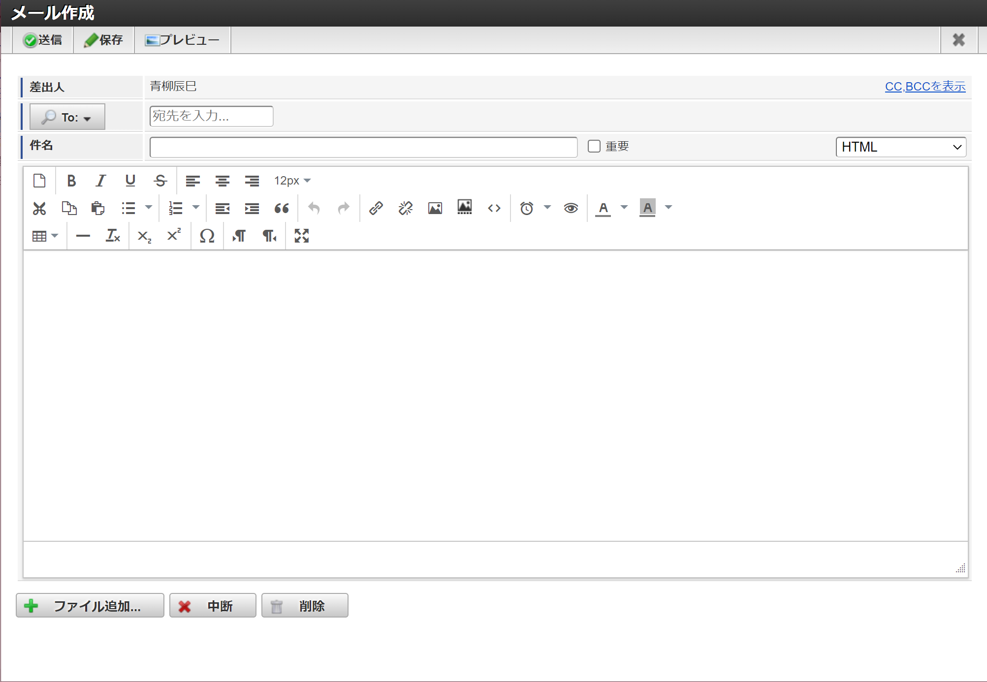 項目 説明 差出人 メールの差出人(ログインユーザ)のユーザ名を表示します。TO 宛先(TO)を設定します。画面表示時は以下の通りに宛先を設定します。メール作成(新規) 空欄 メール作成(下書き) 元メールの宛先(TO) 返信 元メールの差出人 全員に返信 元メールの差出人, 元メールの宛先(TO) 転送 空欄 流用 元メールの宛先(TO) CC 宛先(CC)を設定します。画面表示時は以下の通りに宛先を設定します。メール作成(新規) 空欄 メール作成(下書き) 元メールの宛先(CC) 返信 空欄 全員に返信 元メールの宛先(CC) 転送 空欄 流用 元メールの宛先(CC) BCC 宛先(BCC)を設定します。画面表示時は以下の通りに宛先を設定します。メール作成(新規) 空欄 メール作成(下書き) 元メールの宛先(BCC) 返信 空欄 全員に返信 空欄 転送 空欄 流用 元メールの宛先(BCC) 件名 メールの件名を入力します。最大250文字まで入力できます。画面表示時は以下のようになります。メール作成(新規) 空欄 メール作成(下書き) 元メールの件名 返信 “Re:”+元メールの件名 全員に返信 “Re:”+元メールの件名 転送 “Fw:”+元メールの件名 流用 元メールの件名 重要 重要メールの場合にチェックします。画面表示時は以下のようになります。メール作成(新規) チェック無 メール作成(下書き) 元メールの重要チェック 返信 チェック無 全員に返信 チェック無 転送 チェック無 流用 元メールの重要チェック 本文テキスト形式 本文テキスト形式を選択します。● プレーンテキスト● HTML画面表示時は以下のようになります。メール作成(新規) メール個人設定の作成時設定-本文テキスト形式(デフォルトはHTMLが設定されています)メール作成(下書き) 元メールの本文テキスト形式 返信 元メールの本文テキスト形式 全員に返信 元メールの本文テキスト形式 転送 元メールの本文テキスト形式 流用 元メールの本文テキスト形式 本文(HTML) メールの本文をHTML形式で入力します。画面表示時は以下のようになります。メール作成(新規) 空欄 メール作成(下書き) 元メールの本文 返信 メール個人設定の返信内容(デフォルトは元のメッセージを残し、インデントを設定します。)全員に返信 メール個人設定の返信内容(デフォルトは元のメッセージを残し、インデントを設定します。)転送 “\n\n—– forward message start —–\n”+“Subject:”+元メールの件名+”\n”+“Date:”+元メールの受信日時+”\n”+“From:”+元メールの差出人+”\n”+“To:”+元メールの宛先(TO)+”\n”+“Cc:”+元メールの宛先(CC)+”\n”+メール個人設定の転送内容(デフォルトは元のメッセージを残します。)流用 元メールの本文 ■ 転送時の元メール情報について元メールの件名 元メールの件名が空欄の場合は空欄になります。 元メールの受信日時 元メールの受信日時の書式とタイムゾーンは intra-mart Accel Platform の設定に従います。 元メールの差出人 元メールの差出人のユーザ名を設定します。 元メールの宛先(TO) 元メールの宛先(TO)のユーザ名、会社・組織名、パブリックグループ名、プライベートグループ名を設定します。TOが未設定の場合は、”To:”+元メールの宛先(TO)+”\n”は設定されません。元メールの宛先(CC) 元メールの宛先(CC)のユーザ名、会社・組織名、パブリックグループ名、プライベートグループ名を設定します。CCが未設定の場合は、”Cc:”+元メールの宛先(CC)+”\n”は設定されません。■ リッチテキストエディタ(TinyMCE)の機能についてアイコン 説明 アイコン 説明