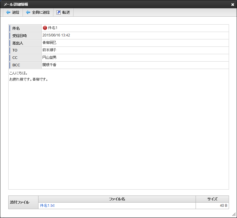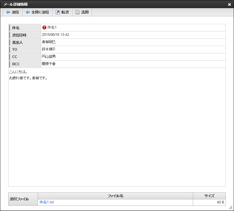 メール詳細画面を閉じます。返信 メール詳細画面「返信」をクリックすると、差出人に返信用の返信メールのメール作成画面を表示します。メール作成画面については「 メール作成画面 」を参照してください。全員に返信 メール詳細画面「全員に返信」をクリックすると、全員に返信用の返信メールのメール作成画面を表示します。メール作成画面については「 メール作成画面 」を参照してください。転送 メール詳細画面「転送」をクリックすると、転送メールのメール作成画面を表示します。メール作成画面については「 メール作成画面 」を参照してください。流用 ログインユーザが自分で作成したメールの場合に表示します。メール詳細画面「流用」をクリックすると、流用メールのメール作成画面を表示します。メール作成画面については「 メール作成画面 」を参照してください。本文のURL 以下の内容を実行します。● ショートカットURL ショートカットURLのサイトに遷移します。● ショートカットURL以外 URLのサイトを別画面で表示します。添付ファイル一覧-ファイル名添付ファイルをダウンロードします。 印刷 注意