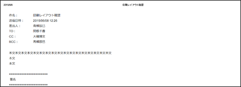 ■ メール詳細画面(受信メール)「サイトマップ」→「GroupMail」→「メール一覧」→「受信箱(もしくは配下のフォルダ)」→「メール一覧からメールを選択」→「メールプレビューの詳細表示」の順にクリックし、画面を表示します。■ メール詳細画面(送信済みメール)「サイトマップ」→「GroupMail」→「メール一覧」→「送信済み(もしくは配下のフォルダ)」→「メール一覧からメールを選択」→「メールプレビューの詳細表示」の順にクリックし、画面を表示します。■ メール詳細ダイアログ(受信メール)■ メール詳細ダイアログ(送信済みメール)■ 印刷レイアウト注意