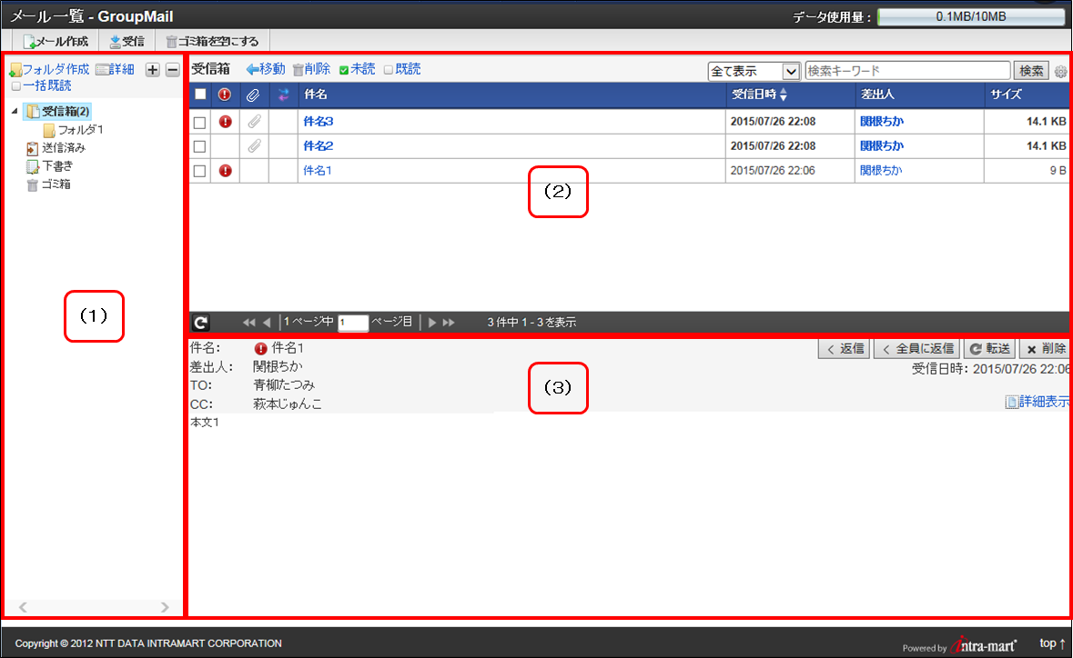 項目 説明 データ使用量 使用しているデータ量と最大データ使用量を表示します。表示形式は以下のようになります。フォルダツリー メール一覧 メールプレビュー メールの内容をプレビュー表示します。画面表示時は非表示となります。メールプレビューについては「 メールプレビュー 」を参照してください。コラム