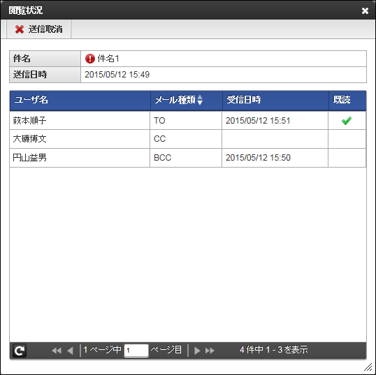 項目 説明 件名 メールの件名を表示します。件名が未設定の場合は”<件名なし>”を表示します。送信日時 メールを送信した日時を表示します。閲覧状況一覧 閲覧状況を一覧に表示します。画面表示時は「メールの種類」の降順で一覧表示されていますが、以下の項目で並び替えを行うことができます。● ユーザ名● メール種類(TO/CC/BCC)● 閲覧日時ページャ部の表示件数切り替え用セレクトボックスは非表示となります。1. ユーザ名宛先のユーザ名を表示します。2. メール種類宛先の種類(TO/CC/BCC)を表示します。3. 受信日時宛先の受信日時を表示します。宛先が受信していない場合は空欄となります。4. 既読既読の場合は、以下の画像を表示します。