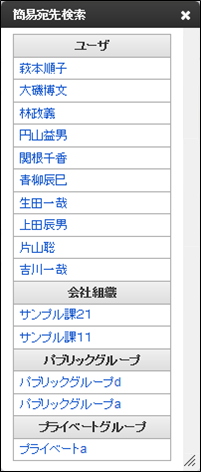 簡易宛先検索ダイアログを閉じます。ユーザ名 ユーザ名を選択すると、選択したユーザをメール作成画面の宛先設定欄末尾に設定します。既に設定されているユーザの場合は設定されません。会社・組織名 会社・組織名を選択すると、選択した会社・組織をメール作成画面の宛先設定欄末尾に設定します。既に設定されている会社・組織の場合は設定されません。パブリックグループ名 パブリックグループ名を選択すると、選択したパブリックグループをメール作成画面の宛先設定欄末尾に設定します。既に設定されているパブリックグループの場合は設定されません。プライベートグループ名 プライベートグループ名を選択すると、選択したプライベートグループをメール作成画面の宛先設定欄末尾に設定します。既に設定されているプライベートグループの場合は設定されません。