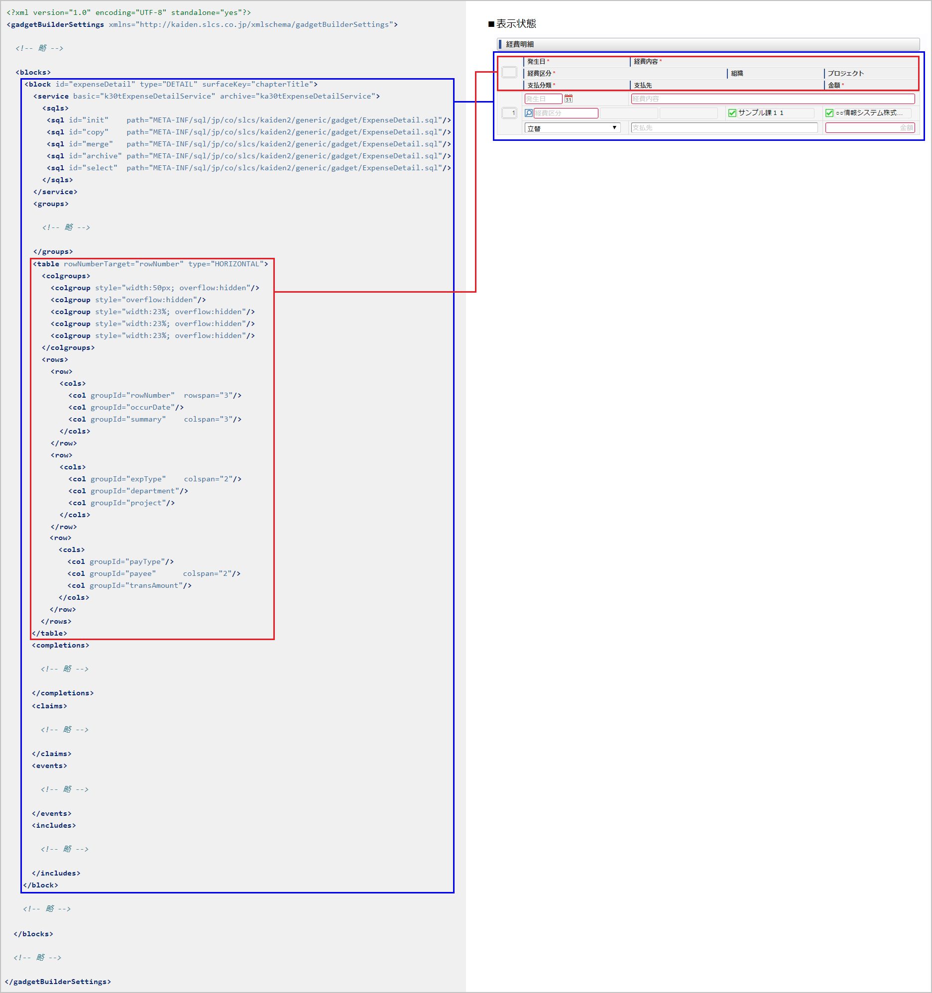 検索を行わない場合(初期表示しない、コピーしないなど)、次の様に設定することで検索を抑止できます。(「notSelect」クラス(コンポーネント名)は検索を行わないクラスです。)<sql id=”copy” component=”notSelect”/> フィールドグループ設定(gadgetBuilderSettings / blocks / block / groups):任意フィールドグループを設定します。後述の「フィールドグループ設定」を参照してください。 構成設定(gadgetBuilderSettings / blocks / block / table):任意PC用画面のガジェット構成を設定します。未設定の場合、ガジェット構成時にフィールドグループ設定順で構成されます。コラム