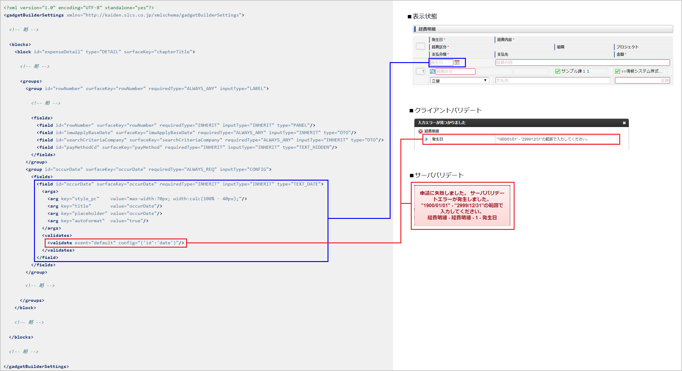 設定値 説明 CLIENT クライアントサイドのみ実行 SERVER サーバーサイドのみ実行 ALWAYS クライアントサイド、サーバーサイドの両方で実行 バリデート内容(gadgetBuilderSettings / blocks / block / groups / group / fields / field / validates / validate @ config):任意フィールドバリデートの内容を設定します。詳細は「バリデート処理」を参照してください。