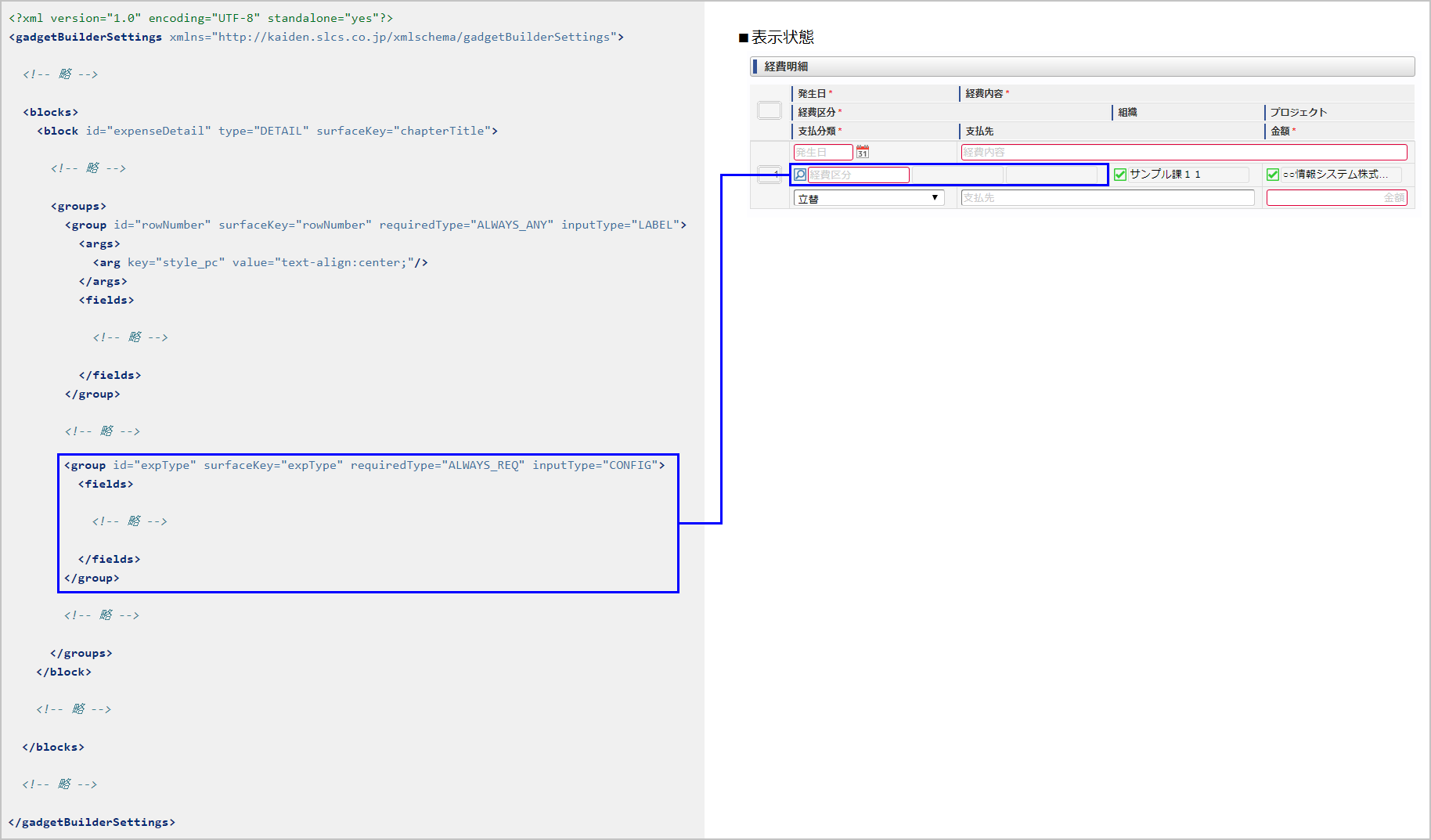 申請書用のガジェットの場合は、申請書マスタメンテナンスでの設定で上書きされます。 フィールド設定(gadgetBuilderSettings / blocks / block / groups / group / fields):任意内包するフィールドを設定します。後述の「フィールド設定」を参照してください。 引数設定(gadgetBuilderSettings / blocks / block / groups / group / args):任意フィールドグループへの引数を設定します。主に、「class」属性や「style」属性の値となります。