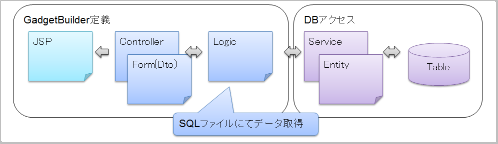GadgetBuilder定義の標準設定で対応できない場合は、独自のJSPやLogicを作成し、設定することで拡張することができます。GadgetBuilder定義の標準設定で対応できる場合は、拡張設定を行う必要はありません。コラム