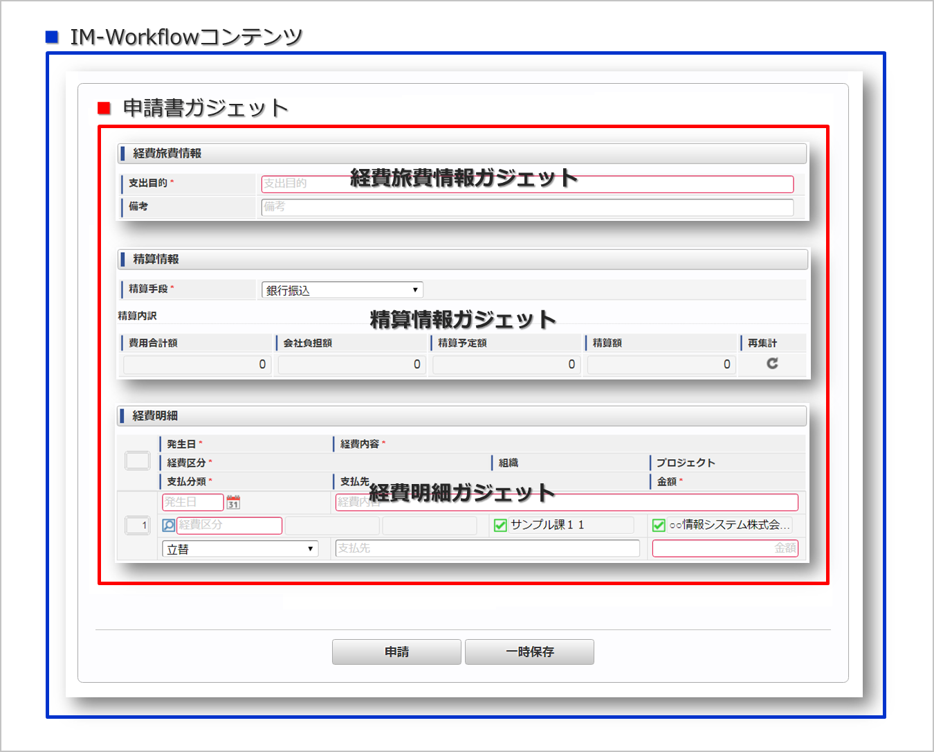 「warning」、「information」を設定したガジェットは、情報明細ガジェットを同じ申請書に組み込んでください。「warning」、「information」を設定した場合、チェックがNGの際も申請可能です。アラート処理の詳細は『intra-mart Accel Kaiden! 経費旅費 / 管理者操作ガイド』を参照してください。