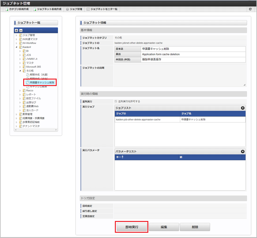 キャッシュ削除ジョブを実行後、申請書マスタメンテナンスを更新します。 キャッシュ削除ジョブを実行後、申請書キャッシュ削除ジョブを実行します。コラム