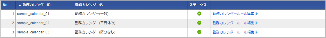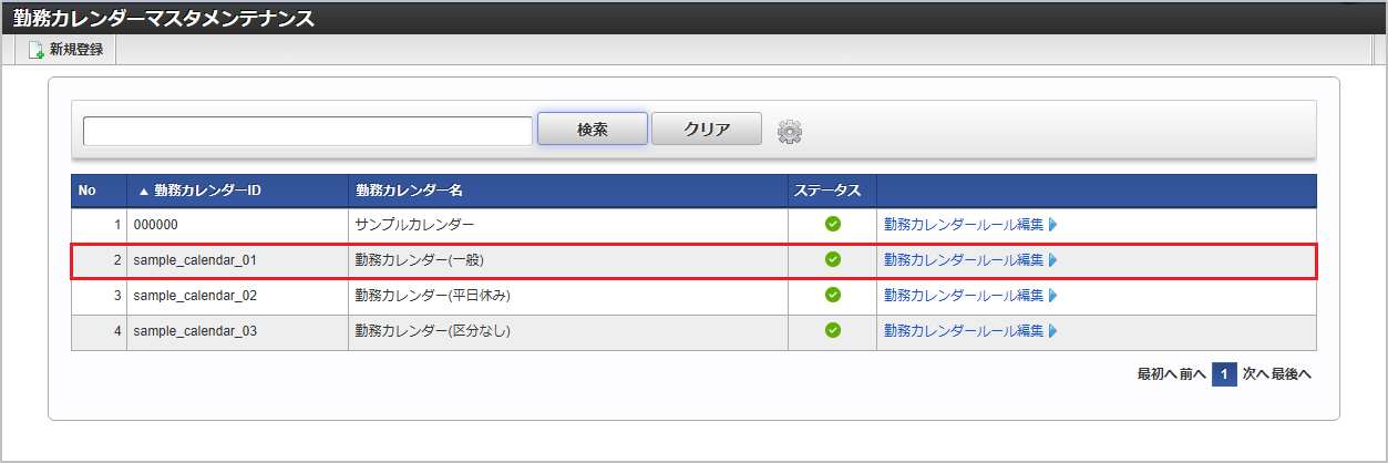 勤務カレンダーID 勤務カレンダー名 一覧画面の対象データが表示されている行をクリックします。コラム