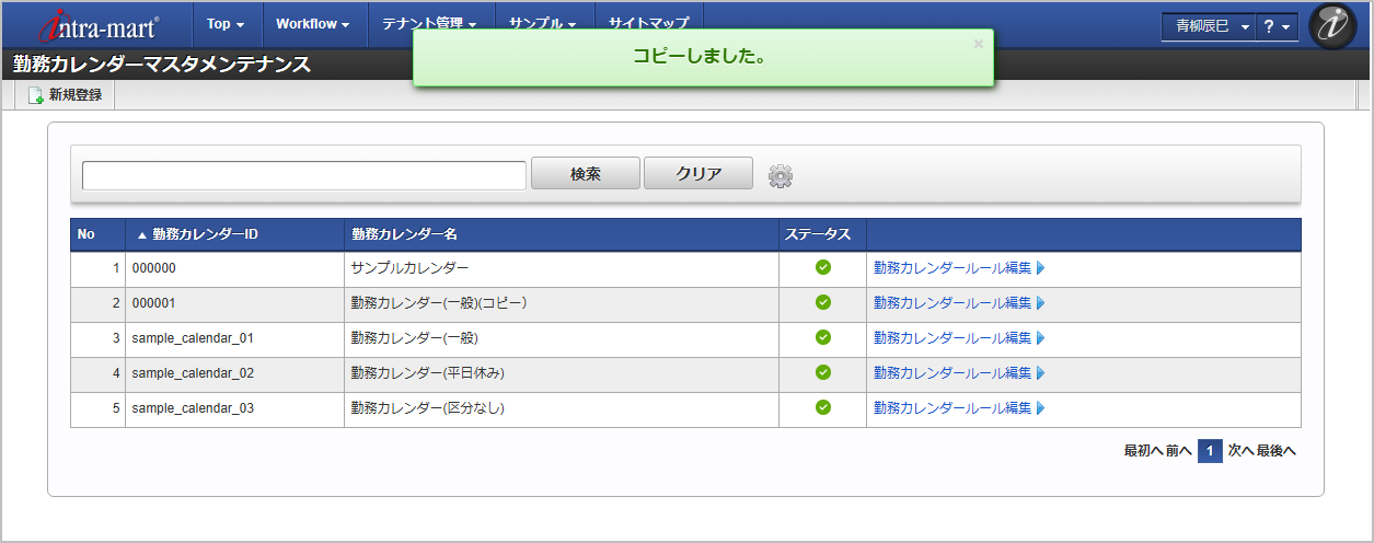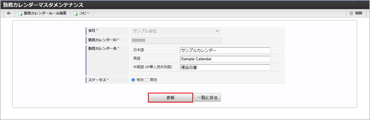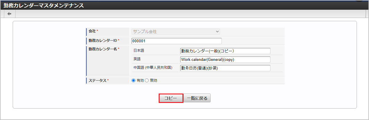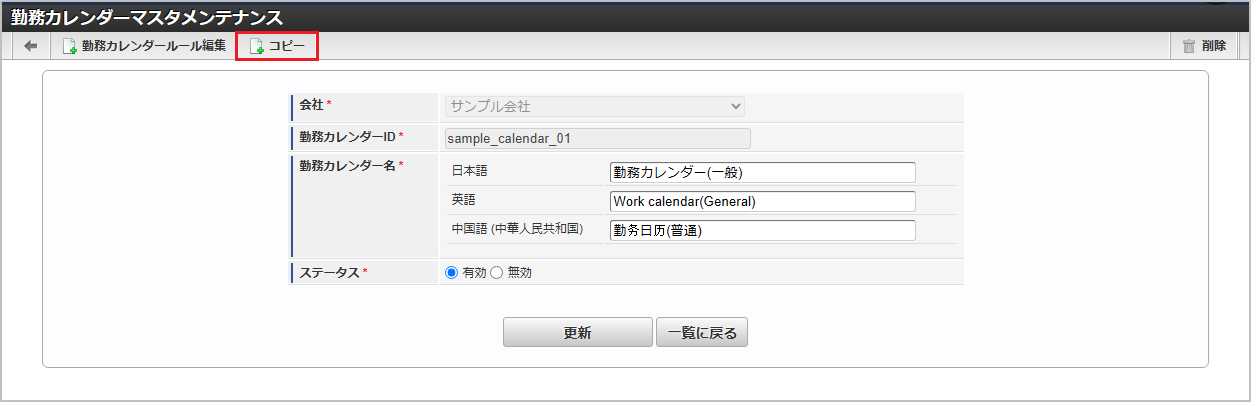 一覧機能の操作方法は、一覧画面の操作を参照してください。 登録/更新画面で「コピー」をクリックします。 「勤務カレンダーマスタメンテナンス(更新)」画面で情報を編集し、「コピー」をクリックします。次の項目は編集不可項目です。