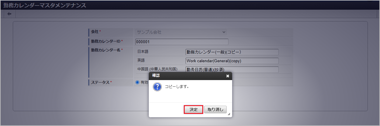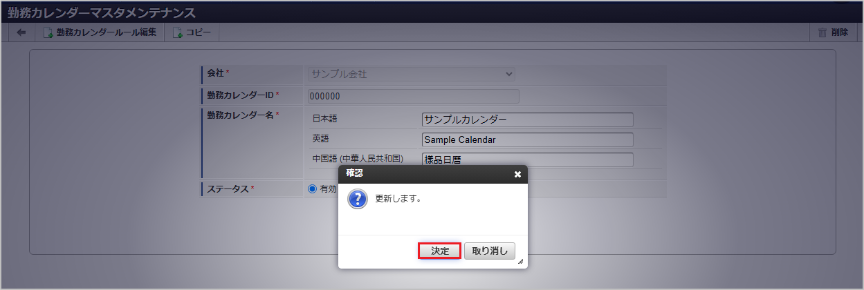 確認ポップアップが表示されますので、「決定」をクリックします。 勤務カレンダーと勤務カレンダールールをコピーすることができました。