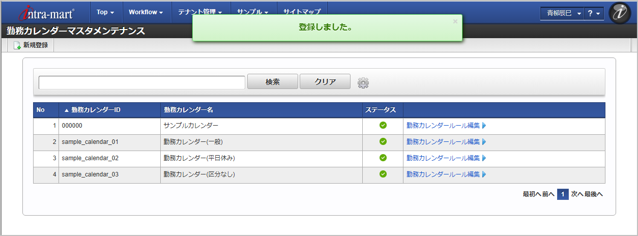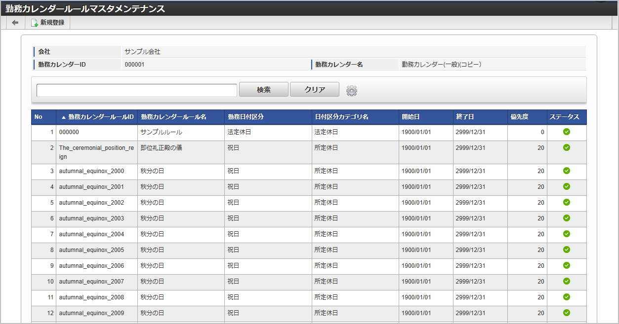 勤務カレンダー一覧画面の「勤務カレンダールール編集」をクリックします。 一覧画面表示後、「新規登録」をクリックします。 登録/更新画面で必要な情報を入力し、「登録」をクリックします。