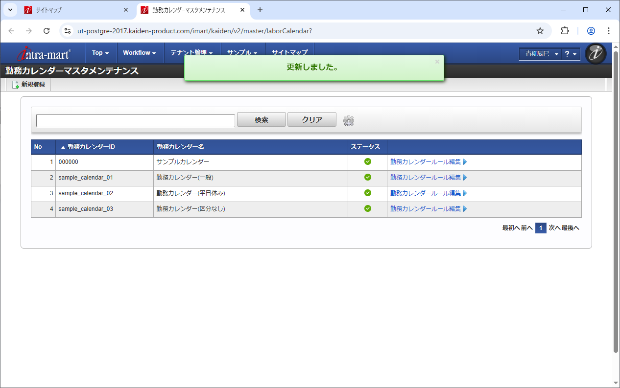 「サイトマップ」→「勤務管理」→「マスタメンテナンス」→「勤務カレンダー」をクリックします。 一覧画面で「検索」をクリックします。コラム