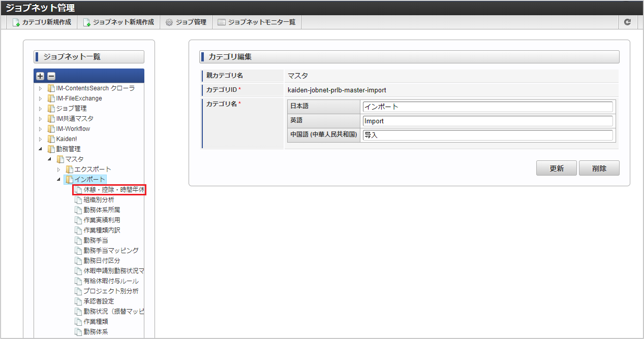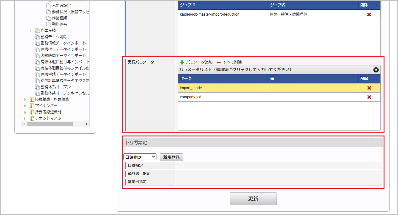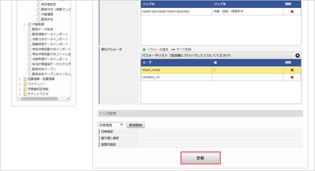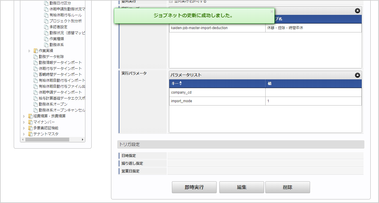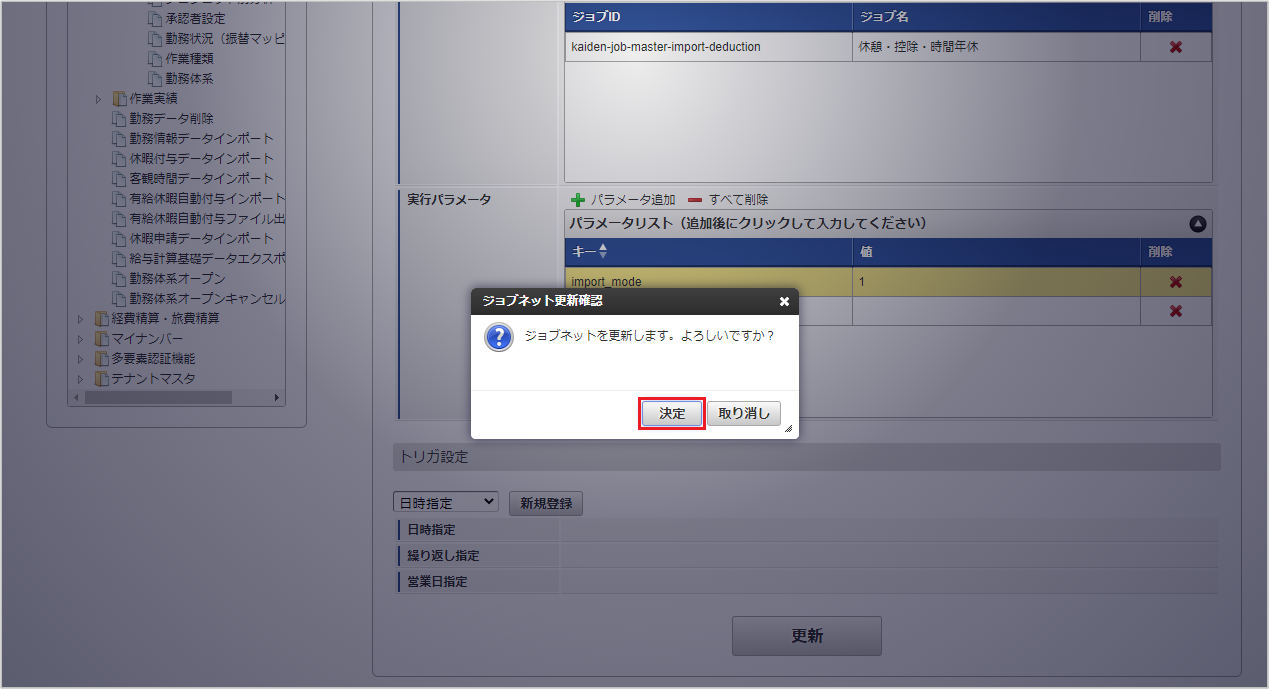ジョブID ジョブ名(ジョブ選択時のツリー) kaiden-job-master-import-deduction 勤務管理 / マスタ / インポート / 休憩・控除・時間年休 編集後、「更新」をクリックします。 確認ポップアップの「決定」をクリックします。 ジョブネットが設定されました。コラム