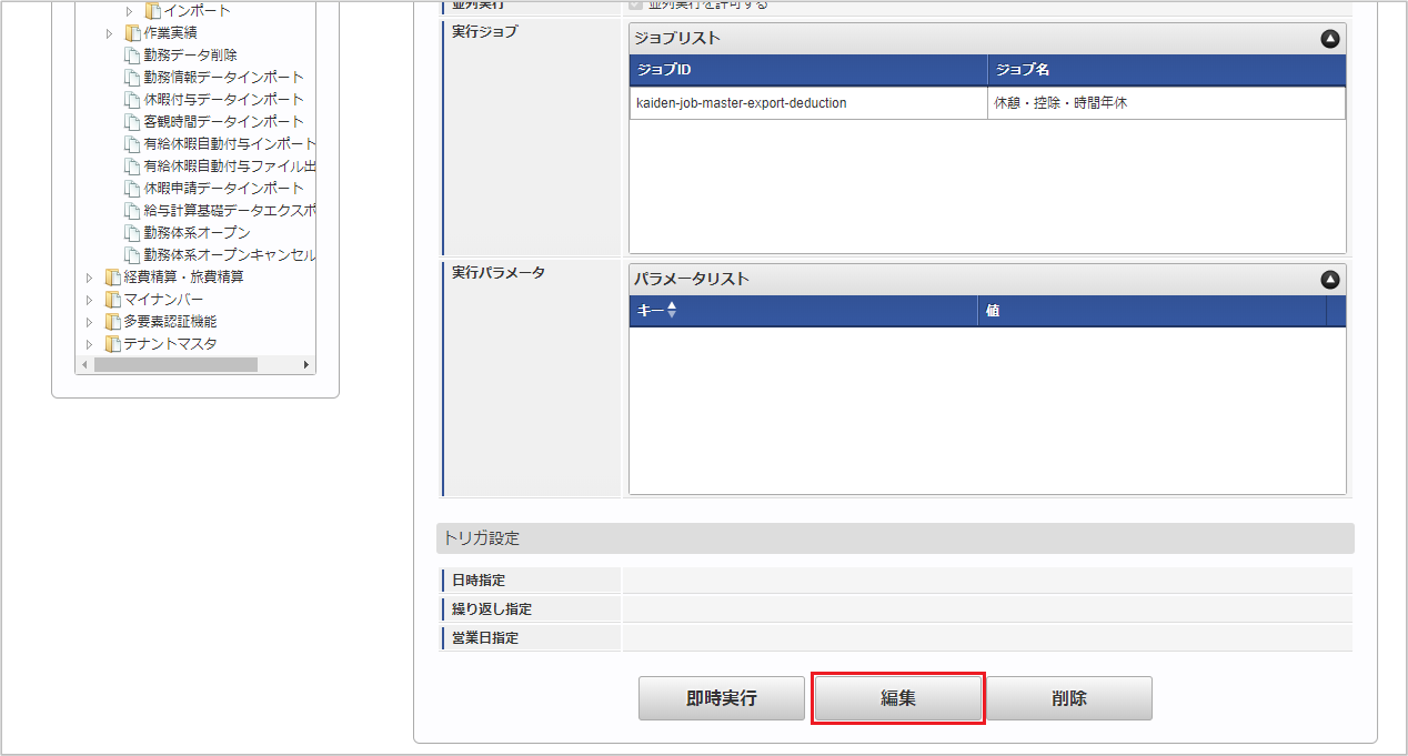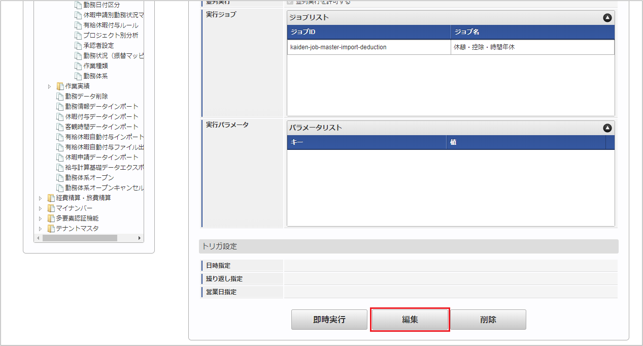 「サイトマップ」→「テナント管理」→「ジョブネット設定」をクリックします。 ジョブネット一覧(画面左部)の「休憩・控除・時間年休」をクリックします。 「編集」をクリックします。 必要に応じて「実行パラメータ」、「トリガ設定」を編集します。コラム
