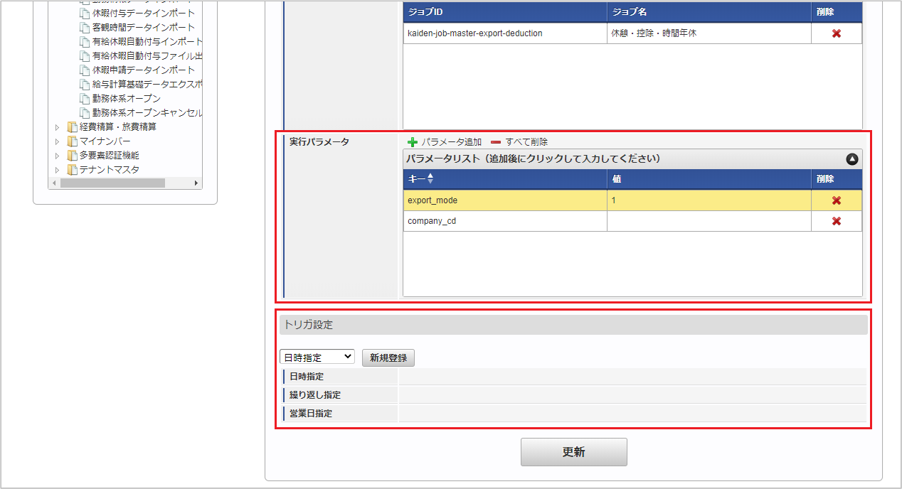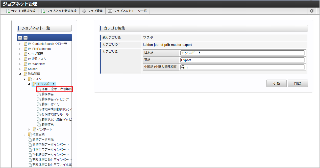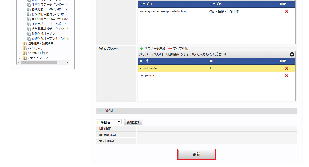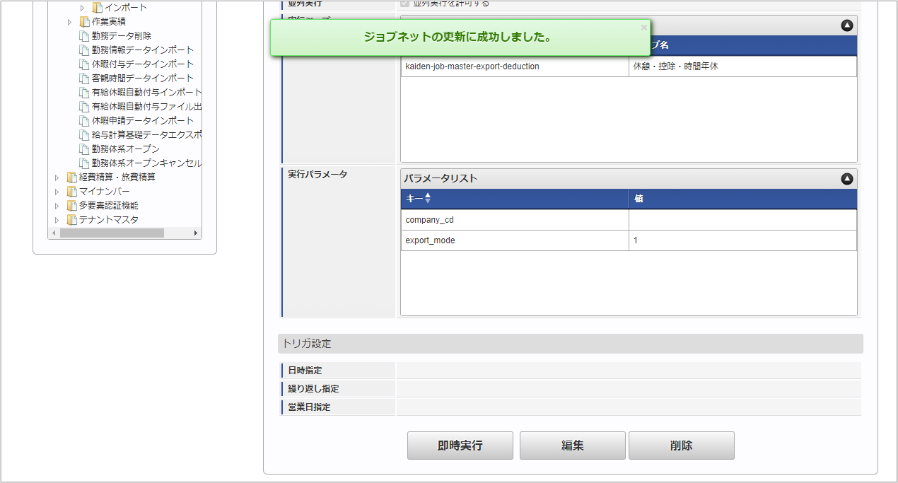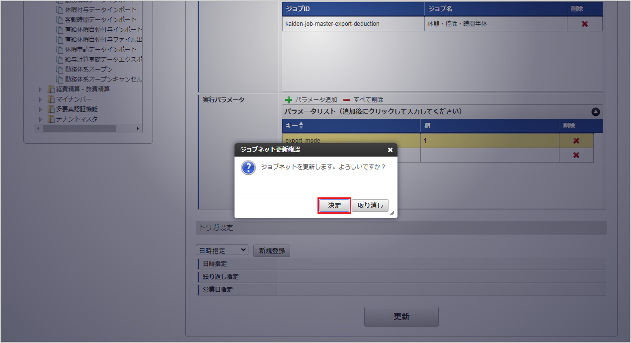 ジョブID ジョブ名(ジョブ選択時のツリー) kaiden-job-master-export-deduction 勤務管理 / マスタ / エクスポート / 休憩・控除・時間年休 編集後、「更新」をクリックします。 確認ポップアップの「決定」をクリックします。 ジョブネットが設定されました。