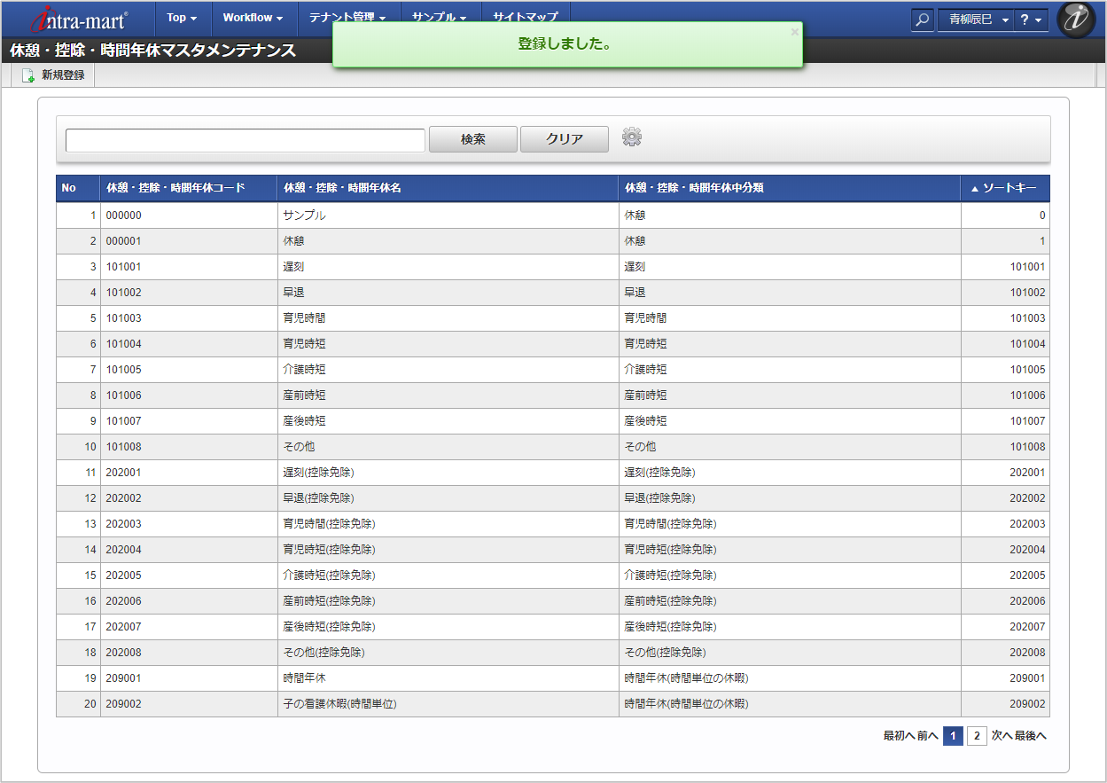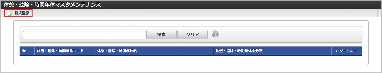 「サイトマップ」→「勤務管理」→「マスタメンテナンス」→「休憩・控除・時間年休」をクリックします。 一覧画面表示後、「新規登録」をクリックします。 登録/更新画面で必要な情報を入力し、「登録」をクリックします。