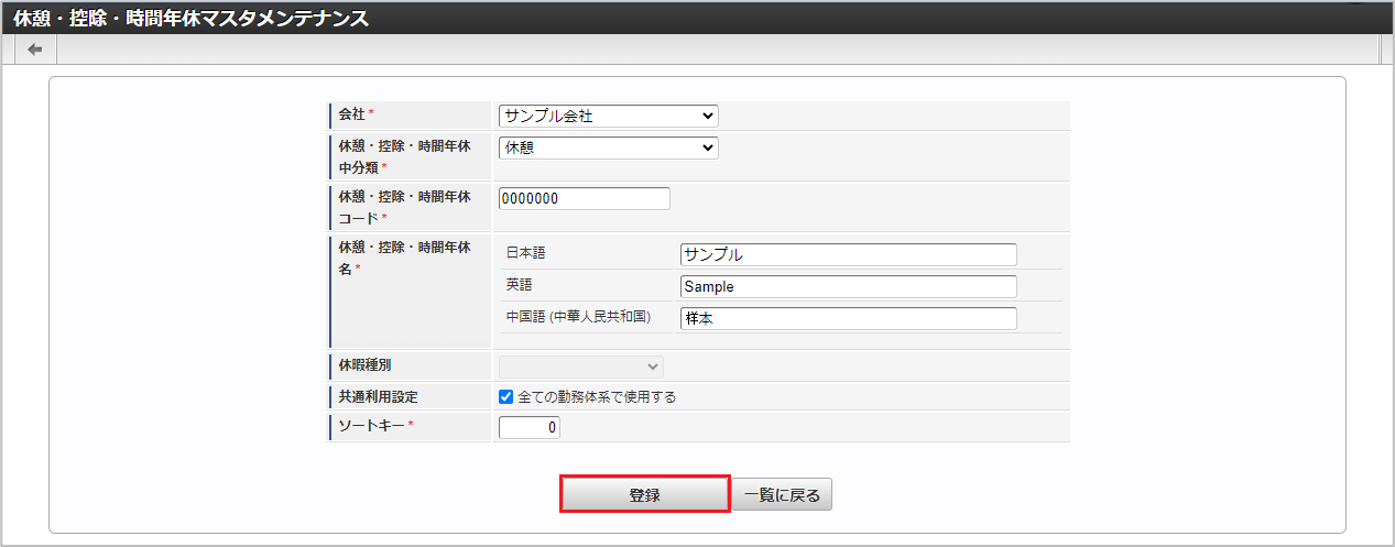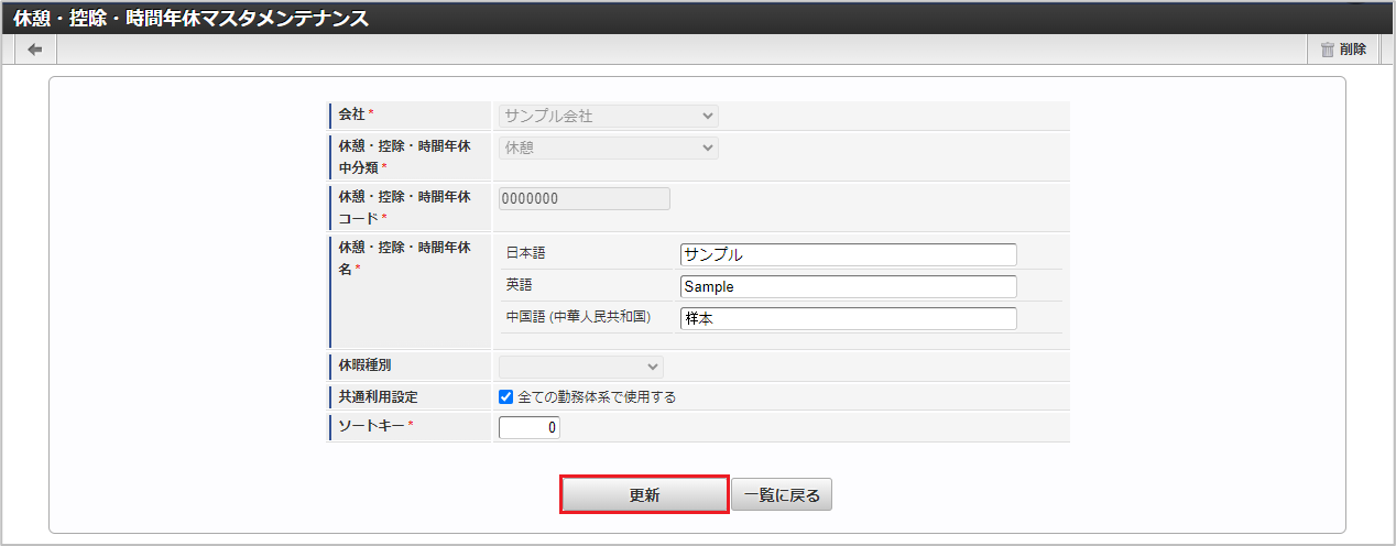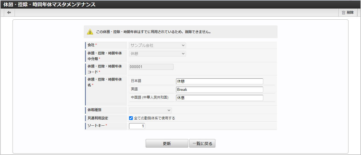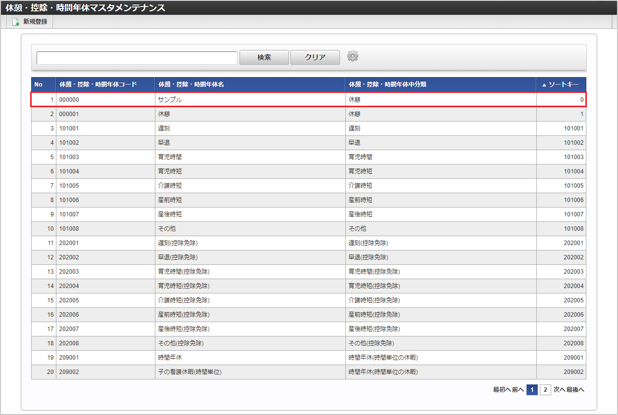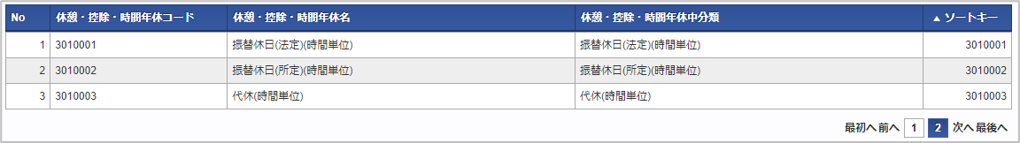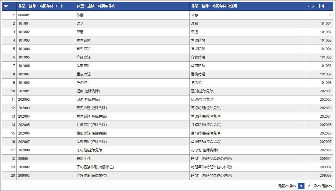 休憩・控除・時間年休中分類休憩・控除・時間年休が属する休憩・控除・時間年休中分類を選択します。 休憩・控除・時間年休コード会社ごとに一意のコードを入力します。 休憩・控除・時間年休名休憩・控除・時間年休の名称を入力します。 休暇種別休暇種別を選択します。休憩・控除・時間年休中分類が「時間年休」の場合のみ利用できます。 ソートキー画面の表示順を半角数字で入力します。表示順は昇順(値の小さい順)です。コラム