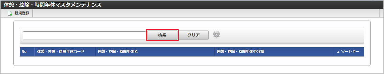 「サイトマップ」→「勤務管理」→「マスタメンテナンス」→「休憩・控除・時間年休」をクリックします。 一覧画面で「検索」をクリックします。コラム