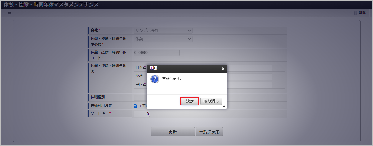 休憩・控除・時間年休中分類が「時間年休」で、休暇種別が未選択の場合は「有給休暇」として扱われます。 確認ポップアップが表示されますので、「決定」をクリックします。 新規登録することができました。