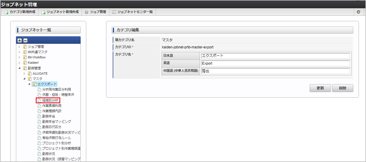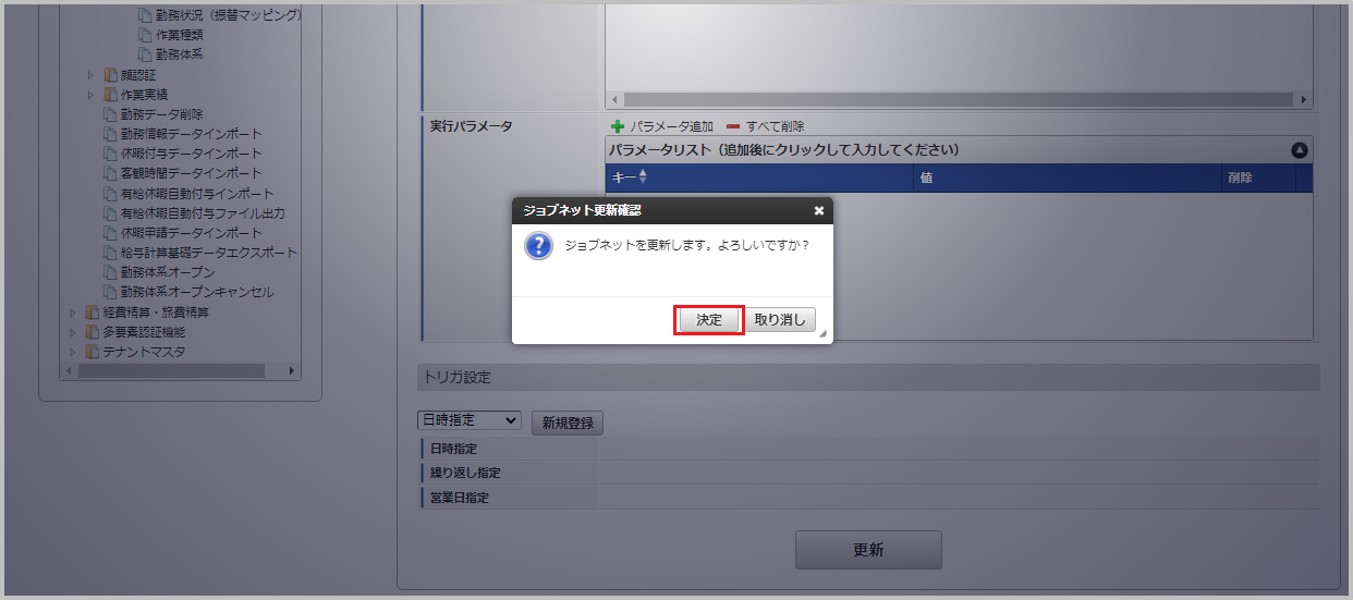ジョブID ジョブ名(ジョブ選択時のツリー) kaiden-job-master-export-deptAnalysis 勤務管理 / マスタ / エクスポート / 組織別分析 編集後、「更新」をクリックします。 確認ポップアップの「決定」をクリックします。 ジョブネットが設定されました。