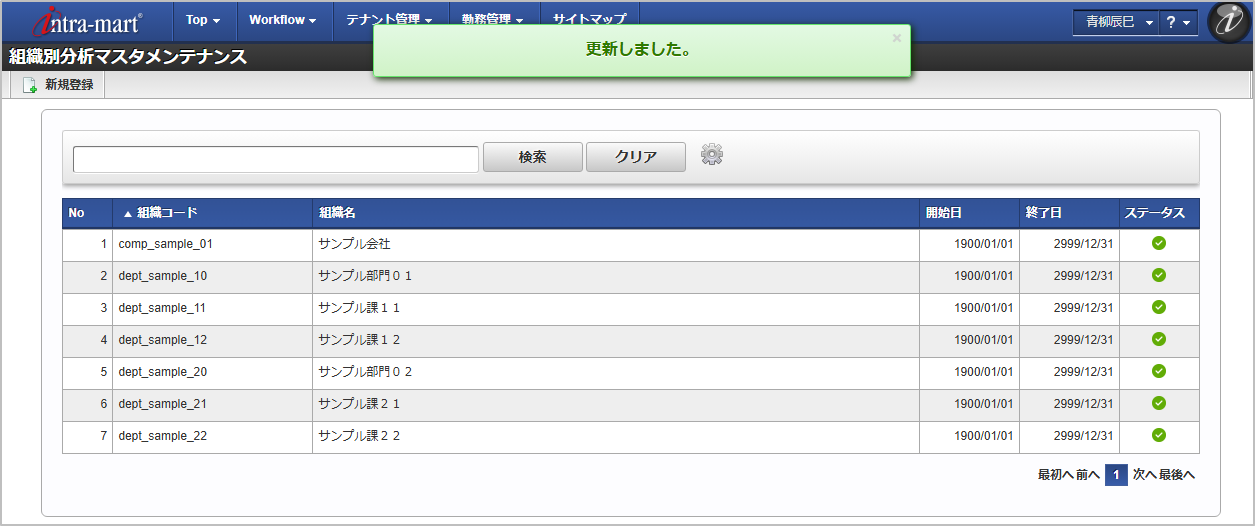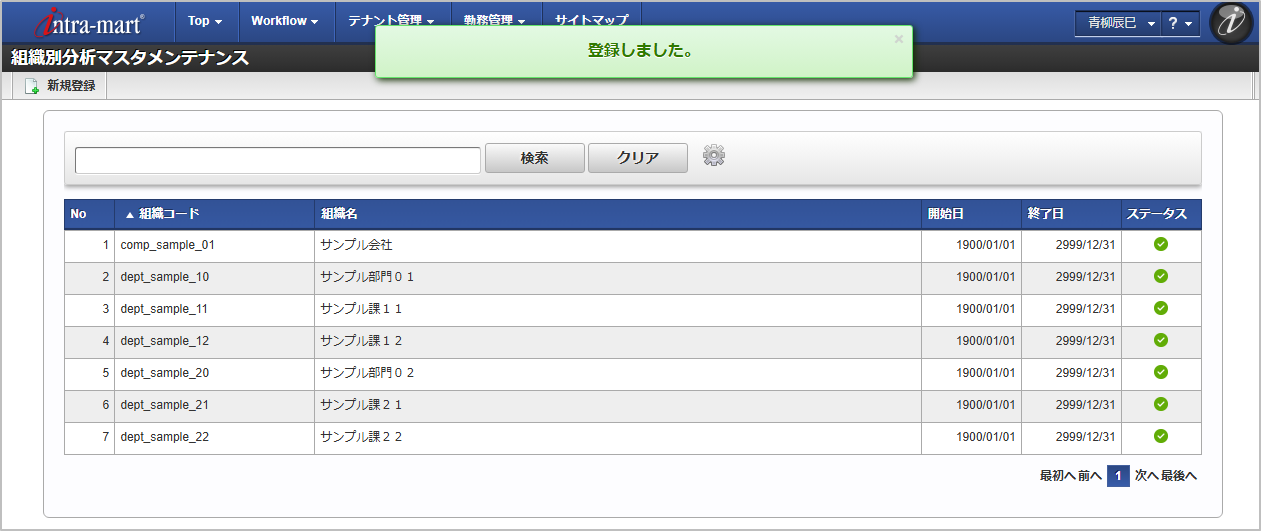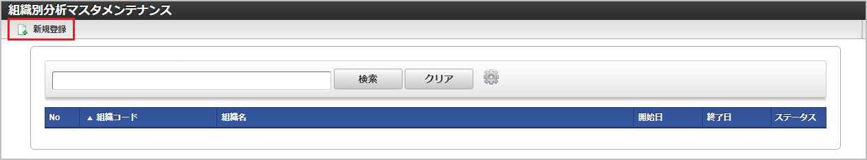 「サイトマップ」→「勤務管理」→「マスタメンテナンス」→「組織別分析」をクリックします。 一覧画面表示後、「新規登録」をクリックします。 登録/更新画面で必要な情報を入力し、「登録」をクリックします。