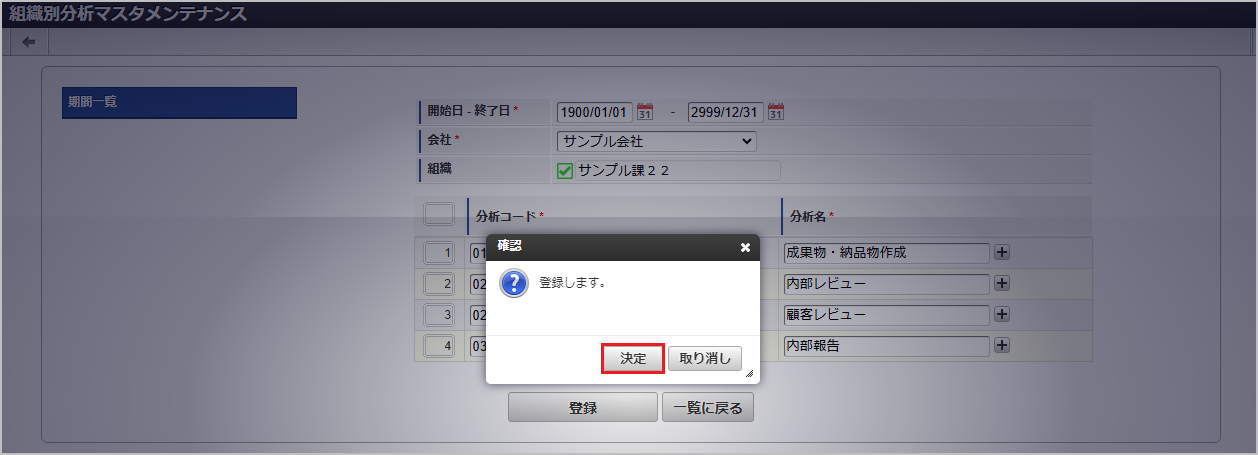 期間機能の操作方法は、 期間の操作 を参照してください。 確認ポップアップが表示されますので、「決定」をクリックします。 更新することができました。