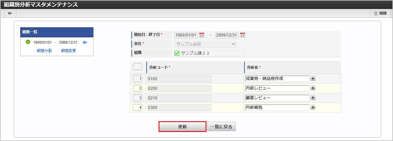 組織会社ごとに一意の組織を選択します。 分析コード組織ごとに一意のコードを入力します。 分析名分析の名称を入力します。コラム