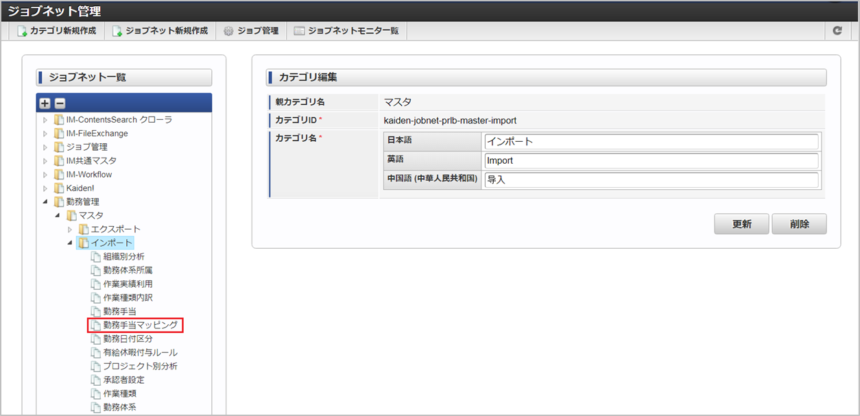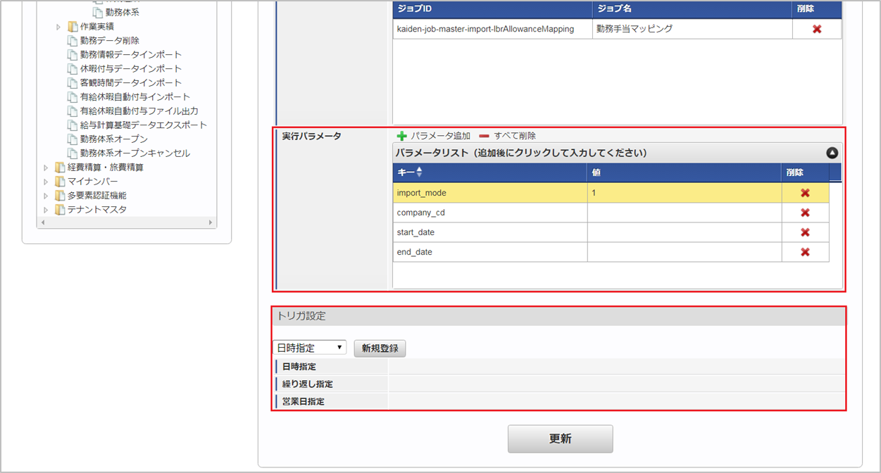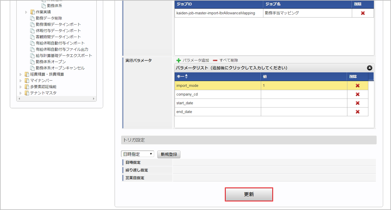 ジョブID ジョブ名(ジョブ選択時のツリー) kaiden-job-master-import-lbrAllowanceMapping 勤務管理 / マスタ / インポート / 勤務手当マッピング 編集後、「更新」をクリックします。 確認ポップアップの「決定」をクリックします。 ジョブネットが設定されました。コラム