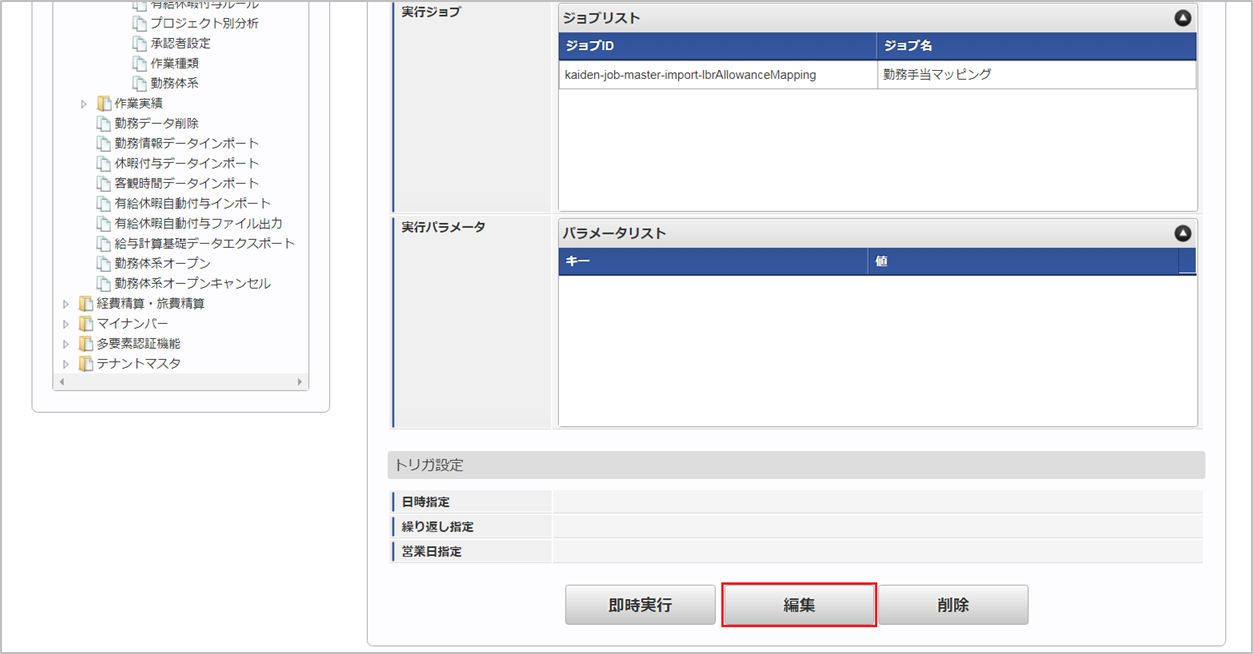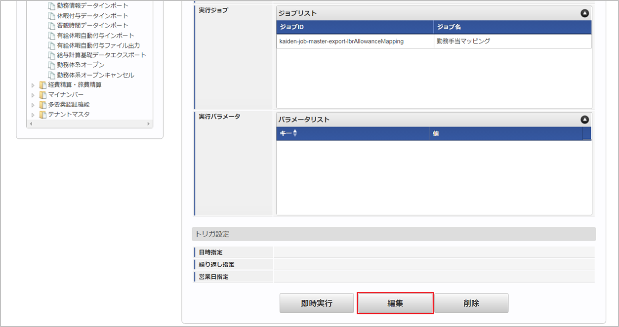 「サイトマップ」→「テナント管理」→「ジョブネット設定」をクリックします。 ジョブネット一覧(画面左部)の「勤務手当マッピング」をクリックします。 「編集」をクリックします。 必要に応じて「実行パラメータ」、「トリガ設定」を編集します。コラム